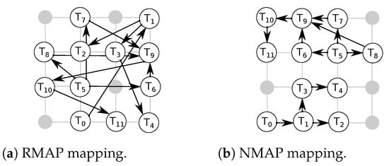 We considered random (RMAP) and near (NMAP) mappings. In NMAP, communicating tasks are placed in close proximity to each other to reduce average packet latencies. We mapped the applications on networks. Multiple tasks are mapped on a single core for applications with more task count than network node count. Examples of such applications include MMS and E3S telecom applications. For such applications, the task execution is performed sequentially. For example, if tasks and are mapped on the same core. Then, the execution begins with followed by and then back to . Figure 18a and Figure 18b respectively show the RMAP and NMAP mappings of the sample application depicted in Figure 17.