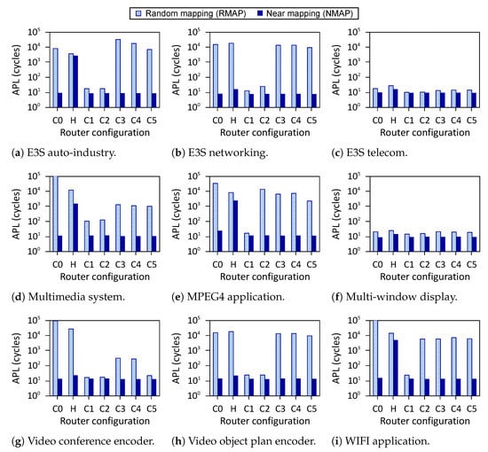 Performance for application. APL: Average packet latency. Y-axis uses log scale (a–i).