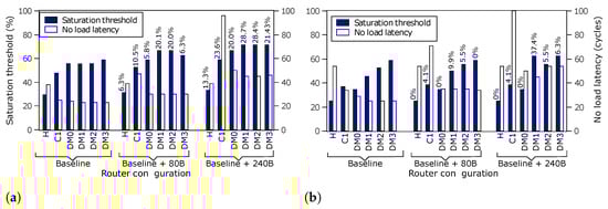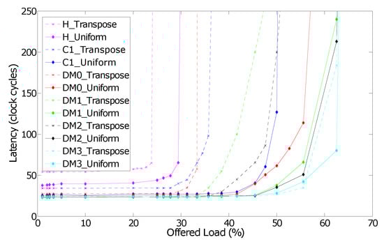 Figure 21 depicts the performance of different router configurations for uniform and transpose traffic patterns. The diagonal links indeed improve network performance for these traffic patterns since they provide shorter paths between network nodes and more communication links. The zero-load packet latency is also reduced with diagonal links. Assigning only the diagonal input and corresponding output ports to a lane further improves the network performance. For instance, it is the case of the DM3 router configuration.