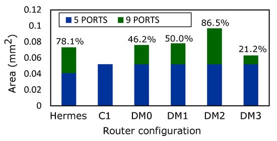 Figure 22 presents the estimated area overhead corresponding to the routers. We display the cost incurred when additional ports are added to the router configuration. It is observed that adding additional ports in Hermes incurs massive costs compared to DM0, DM1 and DM3 routers. On the other hand, it is worth mentioning that the performance of the routers does not solely depend on the area, but on their topological parameters.