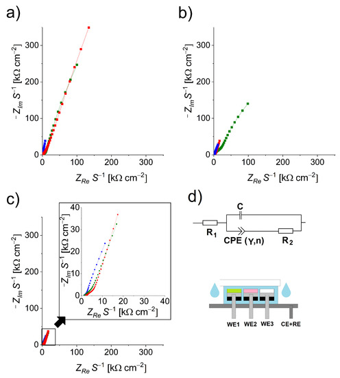 Electrochemical impedance spectroscopy (EIS) was performed using the PalmSens4 instrument (PalmSens, Houten, The Netherlands). An amplitude of 10 mV against a fixed potential of 0 V was used [29,30] and scans were performed in a frequency range from 500 kHz to 1 Hz with 9.8 points per decade (57 points in total per measurement). For all measurements, the working electrode (WE) terminal was connected to one of the smaller electrodes (the electrode under study), whereas the counter electrode (CE) and the reference electrode (RE) terminals were combined and connected to the larger electrode (cf. Figure 1d).