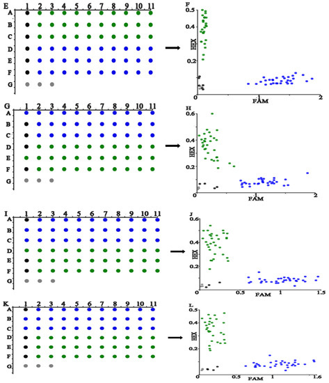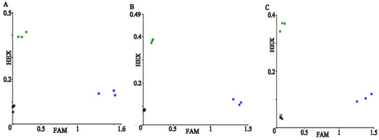 Genotyping results of different templates. Note: (A–C) show the screening results of 452, 484, 501 sites. The blue, green and black signal point represent FAM wild type, HEX mutant type and no amplification respectively, and the gray signal points represent negative control.