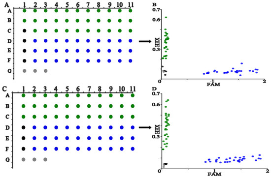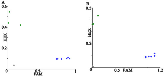 Genotyping results of SARS-CoV-2 cDNA. Note: (A,B) show the screening results of L452R, and K417N sites. The blue, green and black signal point represent FAM wild type, HEX mutant type and no amplification respectively, and the gray signal points represent negative control.