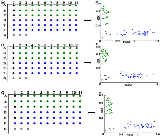 Genotyping results of 3 molecular makers. Note: (A–F), (G–L), and (M–R) are the screening results of L452R, E484K, N501Y mutation sites respectively, (A,C,E,G,I,K,M,O,Q) are the fluorescence scans of the sensitivity test corresponding to the three mutant strains. From left to right, the concentration is 1.28 × 100–1.28 × 1010 copies/μL. The blue, green, black and gray signal point represent the FAM wild type, HEX mutant type, no amplification and negative control respectively.