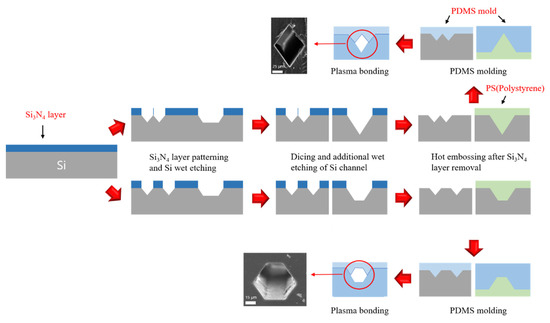 - Lee, D.-K.; Kwon, J.Y.; Cho, Y.H. Fabrication of microfluidic channels with various cross-sectional shapes using anisotropic etching of Si and self-alignment. Appl. Phys. A 2019, 125, 291. [Google Scholar] [CrossRef]