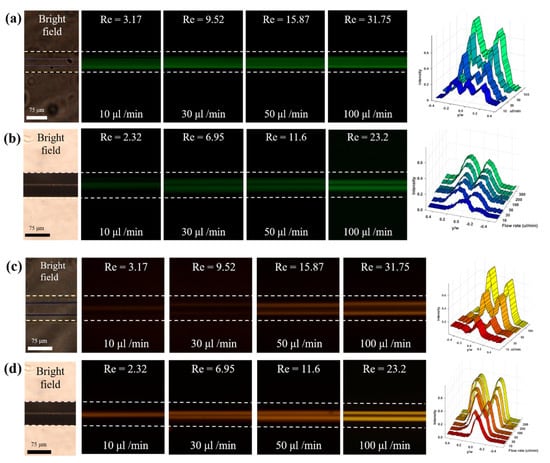 Figure 3a,b shows that the particles with a 5 μm diameter are distributed and scattered around the center of the equilateral hexagonal and rhombic microchannel for low flow rates, less than 10 μL/min, because the inertial force is not strong enough to push entire particles toward their equilibrium positions. As the flow rates increase over 50 μL/min, two inertial focusing points were clearly observed in the rhombic microchannel due to the strong inertial force [30]. In the equilateral hexagonal microchannel, however, particles are still distributed and scattered around the center, showing the wider focusing bands. Although Dh and d are the same for both microchannels, they have different Re for the same flow rate (Q) due to the different cross-section area, as shown in Table 2. Therefore, Rep of the equilateral hexagonal microchannel is smaller than that of the rhombic microchannel. However, the large particles with a 13 μm diameter show the two (rhombus) or four (equilateral hexagon) focusing points over 30 μL/min, as shown in Figure 4c,d. At high Rep for both microchannels, inertial force exerted on a particle was proportional to the fourth of a particle size so that tight and stable particle focusing could be achieved [4].