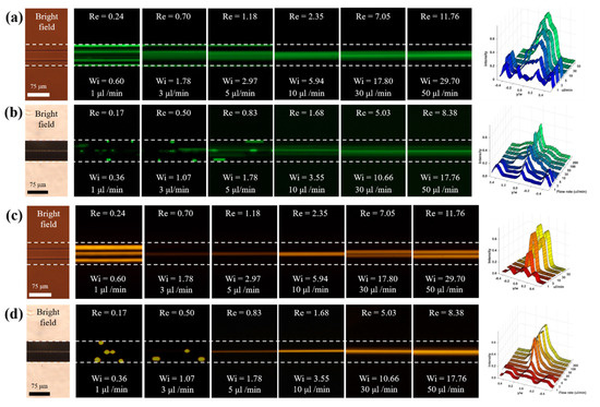 For both microchannels, at low flow rates (Re ≈ 0 and Wi > 0), the equilibrium points of particles with a 5 μm diameter (β = 0.08) were located at the channel center and corners up to the flow rate of 3 μL/min (Figure 4a,b). Therefore, the particles moved either along the center or the corners of the equilateral microchannel (5 peaks) and rhombic microchannel (3 peaks) owing to the negligible inertial force and relevant elastic force. As the flow rate increased up to 10 μL/min (Re > 0 and Wi > 0), the particles were focused at the center of both microchannels under the influence of elasto-inertial force, but the particles were not completely focused in the center, showing a band shape. This is due to the result of competition between the non-negligible inertial lift force and relevant elastic force under viscoelastic fluid flowing through straight microchannel with non-rectangular cross-sectional shape [20,21]. The microchannel with rhombic cross-section shows tighter particle focusing than that with the equilateral hexagonal cross-section.