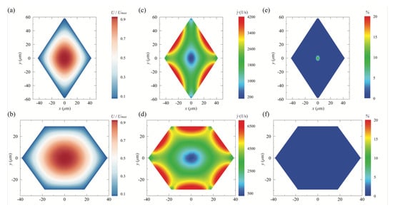 Simulation results of the (a,b) streamwise velocity magnitude (m/s), (c,d) shear rate (1/s), and (e,f) percent discrepancy in the shear rate between the current viscoelastic fluid (PEO500 solution) and DI water in a cross section of the rhombic and equilateral hexagonal microchannel at 10 µL/min.