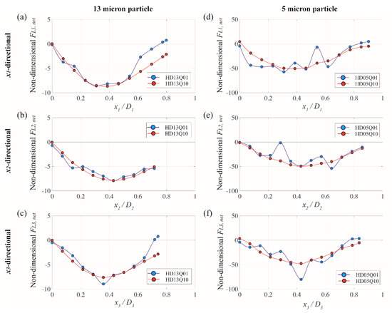 Variation of (a,d) x1-directional, (b,e) x2-directional, and (c,f) x3-directional net elasto-inertial force exerted on 5 and 13 µm particles along the line of symmetry for the equilateral hexagonal microchannel. Blue and red symbols represent the case for the flow rate of 1 and 10 µL/min, respectively.