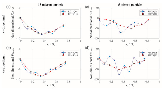 Variation of (a,b) x1-directional, and (c,d) x2-directionall net elasto-inertial force exerted on 5 and 13 µm particles along the line of symmetry for rhombic microchannel. Blue and red symbols represent the case for the flow rate of 1 and 10 µL/min, respectively.