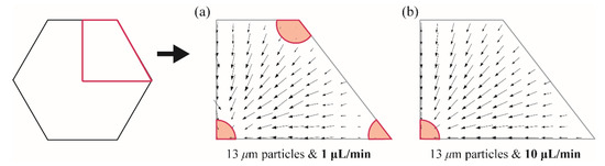 Finally, Figure 8 displays vectors of the net elasto-inertial force in equilateral hexagonal microchannel for 13 µm particles at two different flow rates. Each vector denotes (FL1,net, FL2,net) at each point that varies with the particle position inside the channel. Figure 8 qualitatively shows an equilibrium point on a channel cross-section depending on the fluid inertia (i.e., flow rate). As seen in Figure 8a, the case of HD13Q01 clearly shows three equilibrium points at the channel center and each corner. When increasing the flow rate (HD13Q10), particles may consistently migrate to the channel center independent of their initial position on a cross-section as all vectors are directed toward the center as seen in Figure 8b.