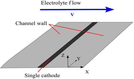 Assume the stationary concentration distribution and the hydrodynamic velocity to be known and find a solution to Equation (7) near the cathode. The cathode is a long thin strip located on a flat non-conducting surface. Consider the fluid flow to be directed perpendicular to the long side of the electrode (Figure 1).
