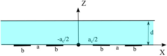 To perform subsequent calculations, specify the geometry of the transforming element. Assume all the electrodes to be located on one wall of the channel bounded by two infinite planes. is the size of the electrodes, is the distance between the cathodes, is the distance between the anode and the adjacent cathode, is the thickness of the channel. The cell is assumed to be symmetric, and the origin of the coordinate system is placed on the channel wall containing the electrodes, at the central point of the electrode structure, as shown in Figure 2.