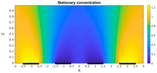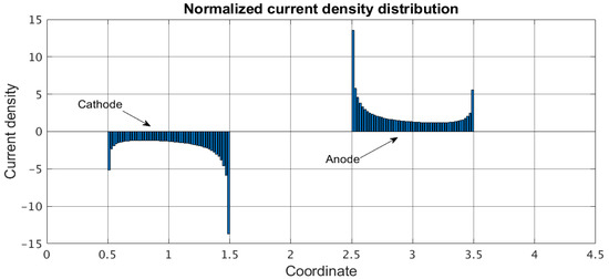 An example of the distribution of the stationary electrode current density according to Equation (24) is shown in Figure 3. In this example, the following geometric parameters of the system are used: . The obtained distribution is characterized by the presence of pronounced maximums of the current density at the edges of the electrodes because of the diffusion of active carriers on these parts of the electrodes not only from the area directly above the electrode but also from the areas adjacent to the electrodes.