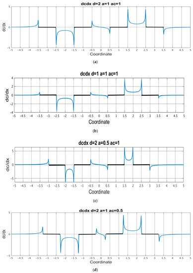 From these figures, for all parameters of the system, the components of the concentration gradient have pronounced extrema at the edges of the electrodes. The indicated peak values deserve special attention since these peaks make the most significant contribution to the integrals of expression (29) when calculating the signal current. Table 1 shows the values of the absolute peak values of the components of the concentration gradient near the cathode edges. The calculations were carried out for two values of the number of segments into which the electrode is divided: and and the difference in the results obtained is presented as an error.