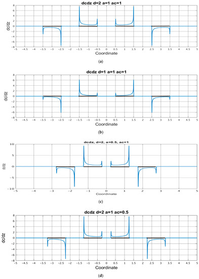 Equation (29) implies that the signal current is expressed through the distribution of the normal and tangential components of the steady-state concentration gradient. For several sets of geometries, the corresponding plots are shown in Figure 6 for tangential components and in Figure 7 for normal components.
