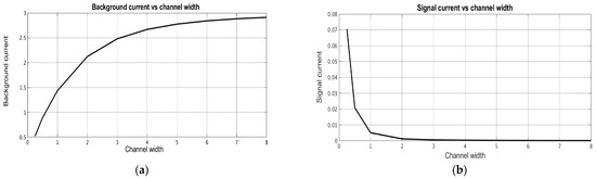 After the distributions of the stationary concentration of the active component were determined, the stationary and signal cathode currents were calculated depending on the geometric characteristics of the converting system. The signal current was determined at Figure 8 shows the dependence of the stationary background current (Figure 8a) and the signal current (Figure 8b) on the channel width , while Figure 9 and Figure 10 show similar dependencies on the interelectrode distances .
