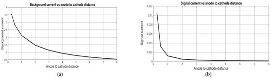 Dependence of (a) stationary background current and (b) signal current on the dimensionless distance between anode and cathode.