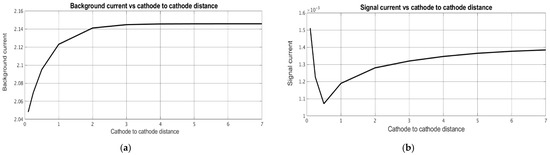 Dependence of (a) stationary background current and (b) signal current on the dimensionless distance between cathodes.