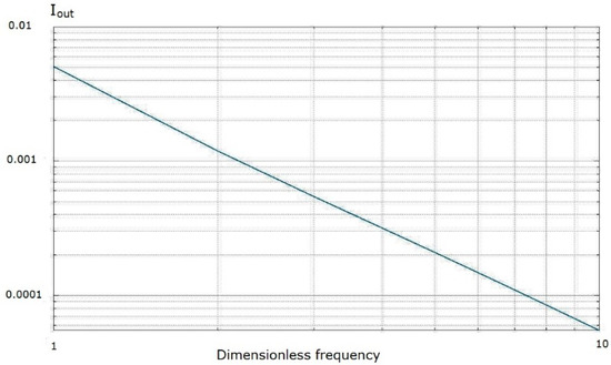 Moreover, the frequency response of the output signal was investigated in the frequency range of dimensionless frequencies from 10 to 1000. The condition is considered to be valid. The graph presented in Figure 11 shows that the frequency dependence has a character of , which practically coincides with the dependence of , as was found experimentally in a number of works [32,33,34,35].