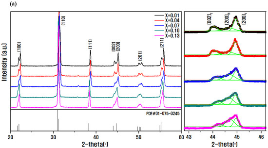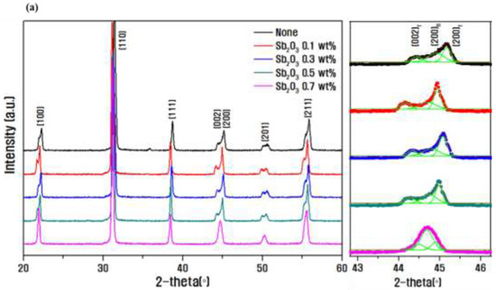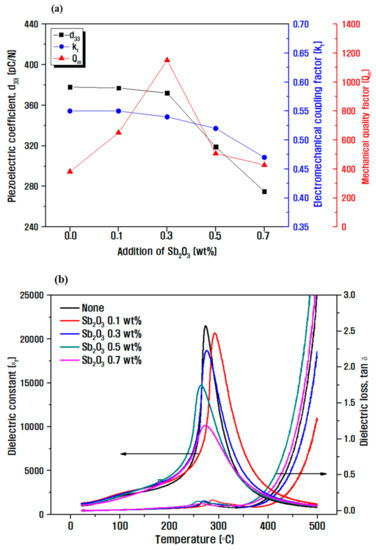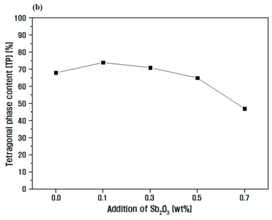 A decrease in the tetragonal phase fraction is confirmed in Figure 1. In addition, to improve the value of the mechanical quality factor while maintaining the characteristic value at x = 0.07, along with excellent piezoelectric and electromechanical coefficients of 378 pC/N and 0.55, respectively, an experiment was conducted to add a doping material, Sb2O3, as a hardener.