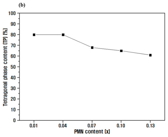 where I(002)T and I(200)T indicate the tetragonal (002) and (200) diffraction peak intensities, respectively, and I(200)R denotes the rhombohedral (200) diffraction peak intensities [10]. The tetragonal phase fraction calculated decreased from 80% to 61% as the PMN molar ratio increased.