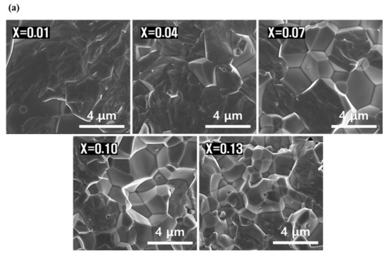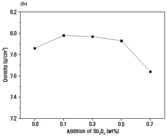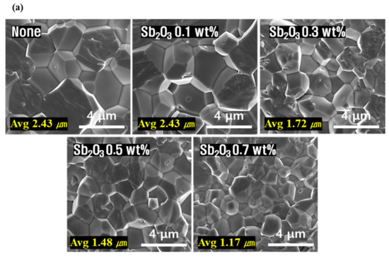 Figure 4 shows the SEM images and density of the microstructures of the fracture surfaces of PNN-PMN-PZT ceramics with different Sb2O3 doping amounts. Figure 4a shows a dense microstructure under all conditions; the average grain size decreased from 2.43 to 1.17 μm with increasing Sb2O3 doping amount [23,24]. Figure 3 confirms that the internal stress in the lattice improved with decreasing crystal size, and phase transition to the rhombohedral phase occurred. As seen in the SEM images, Figure 4b shows a dense structure without pores when Sb2O3 is added, resulting in an excellent value of ~98% relative density with a maximum value of 7.97 g/cm3. The high density can be related to the liquid phase formation due to the low melting point (656 °C) of Sb2O3. It was confirmed that the density also decreased with decreasing particle size.