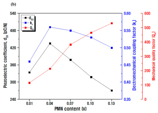 Figure 2b shows the measurement results of electrical characteristics for different composition ratios. The piezoelectric coefficient and electromechanical coupling coefficient were maximum in the composition with x = 0.04; as the PMN molar ratio increased, these coefficients decreased in proportion to the particle size. A higher mechanical quality factor leads to changes to the domain motion, which is inversely proportional to the internal stress; therefore, as the PMN molar ratio increases, the particle size decreases, and the internal stress improves, making it difficult to move the domain. It is considered that the mechanical quality factor continues to increase [18,19,20,21].