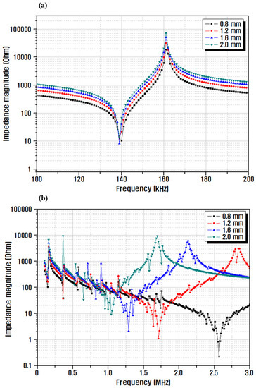 Simulation results of impedance characteristics for different thicknesses of piezoelectric ceramics: (a) radial, and (b) thickness vibration mode.
