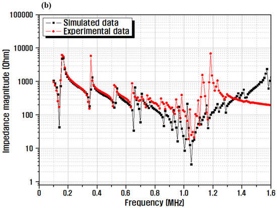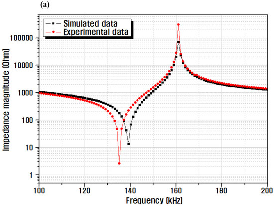 Figure 6 shows the results of the impedance characteristic analysis for different thicknesses of the piezoelectric ceramic via piezo simulation analysis and the results of the impedance analysis for operation of the ultrasonic vibrator element at different frequencies. In the radial vibration mode, the resonant frequency of 139 kHz and anti-resonant frequency of 161 kHz were the same irrespective of the different thickness of the ceramic at the same position. The result of analyzing the resonance mode occurred at a high frequency (Figure 6b). In the thickness vibration mode, for ceramic thicknesses of 0.8 and 2.0 mm, the center frequencies were 2.56 and 1.04 MHz, respectively, confirming the decrease in frequency [32,33,34].