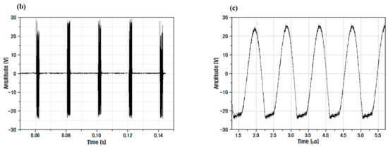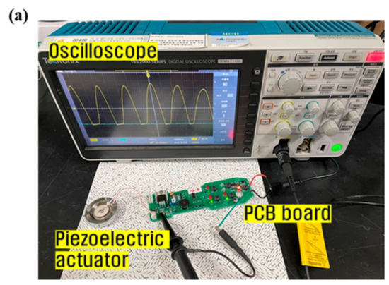 The experimental apparatus for performance evaluation of the fabricated ultrasonic vibrator and the analysis results of the ultrasonic output waveform are presented in Figure 8. To measure the center frequency and waveform of the ultrasonic vibrator fabricated seen in Figure 8a, a self-oscillating PCB circuit that induces oscillation of the vibrator by generating a sinusoidal oscillation frequency and an ultrasonic vibrator were assembled. A voltage of 24 V was applied to the circuit, and the signal output from the oscillation of the ultrasonic vibrator at the center frequency was confirmed by connecting it to the oscilloscope equipment. By enlarging the detailed waveform of the modulated signal from the entire waveform in Figure 8b, the maximum amplitude was shown to oscillate at a frequency of 1.06 MHz, as shown in Figure 8c. The maximum output waveform yielded a value of 28 V. The simulation value was 1.04 MHz, but there was no significant difference at 1.06 MHz in the waveform measurement results of the fabricated sample.
