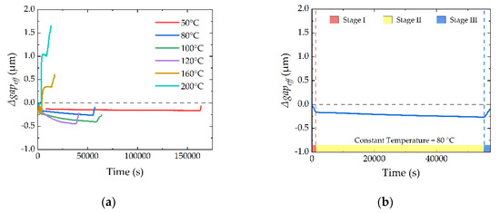 Figure 17b is grain growth. At 160 and 200 °C, the grains of the cantilever reach a stable state, and the thermal–mechanical stress in the device is released by the grain growth. So, there is no significant creep phenomenon. The x-axis in
