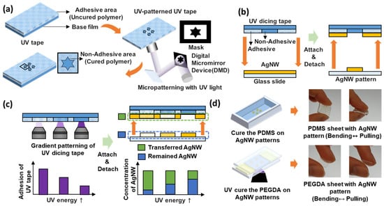 AgNWs (Average diameter: ~30 nm, average length: ~30 µm, dispersion solvent: Ethanol, concentration: 10 mg/mL) were purchase from 4 Science, Seongnam-si, Korea. UV dicing tape (DU 390EH) was purchased from ADTECH CO., Ltd., Gimpo-si, Korea. The PDMS elastomer for transferring the AgNWs pattern (Sylgard 184) was purchased from Dow Corning Co., Ltd., Midland, MI, USA. The poly(ethylene glycol) diacrylate 700 (Sigma-Aldrich, St. Louis, MI, USA) and 10 vol% Irgacure 1173 (BASF) as a photoinitiator was used for transferring the AgNWs pattern.