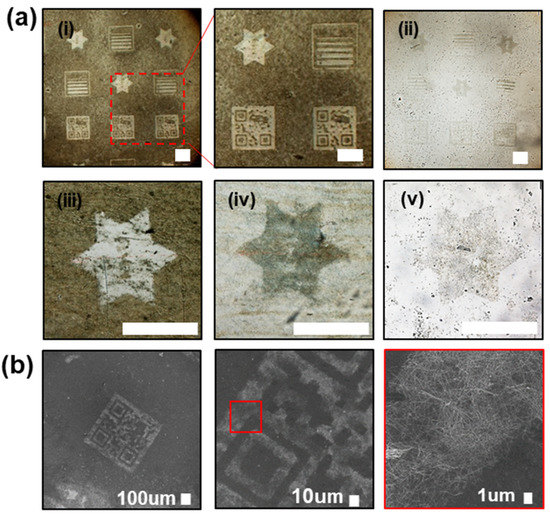 Image of an AgNW pattern fabricated using UV dicing tape. Hexagram pattern, resolution test pattern, and 2D barcode pattern were fabricated. (a) Bright-field image of the AgNW pattern. (Scale bar: 500 µm) (i) UV-patterned UV dicing tape after attachment and detachment from the AgNW-coated glass slide. AgNWs were attached to the UV dicing tape, except in the area where the adhesion was reduced by UV irradiation. (ii) Residual AgNW pattern on the glass slide after the attachment/detachment process. Images of the (iii) UV dicing tape, (iv) AgNW-patterned glass slide, and (v) AgNW pattern transferred to the PDMS substrate. (b) SEM image of the AgNW pattern on a glass slide, which confirms that the 2D barcode was patterned with sharp edges.