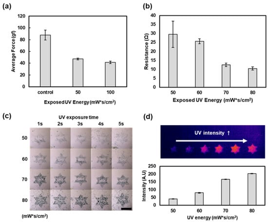 Furthermore, the UV energy was controlled within the range of 50–80 mW s/cm2 to fabricate a 3 cm × 3 cm square pattern. The electrical resistance of the AgNWs remaining on the glass slide was measured using a four-probe measurement method. The electrical resistances of the AgNW patterns fabricated using 50, 60, 70, and 80 mW s/cm2 UV energy were 29.4, 25.6, 12.4, and 10.4 ohm, respectively. In summary, when the UV dicing tape was irradiated with a large amount of UV, the amount of residual AgNWs on the glass slide increased, and the electrical resistance was low (Figure 3b).