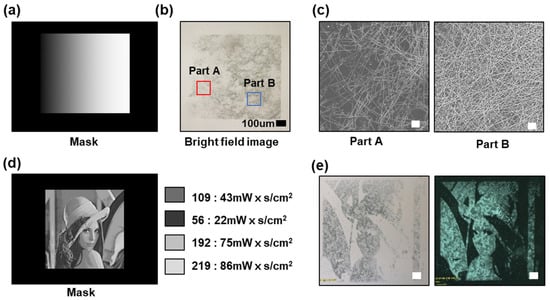 Figure 4b shows a bright-field image of the AgNW micropattern fabricated using the mask shown in Figure 4a. SEM images of different regions of this pattern with different AgNW concentrations are shown in Figure 4c, which demonstrates the difference in the density of the AgNWs in different regions. Figure 4d shows a DMD mask with a Lena image, which is a complex gradient pattern. The amount of UV energy irradiated varies according to the grayscale of the mask. Both bright-field and dark-field images of the AgNW micropattern fabricated using this DMD mask are shown in Figure 4e for clear visualization of the pattern.