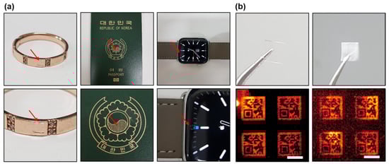 Anti-counterfeiting technology is widely used in various applications in pharmaceutics, agriculture, fashion and apparel, food, winery and liquor, perfumery, cosmetics, jewelry, and electronics [1,2,3]. In order to achieve anti-counterfeiting applications, various electrical, chemical, and mechanical methods are used. With the development of IC technology in electrical approaches, small-sized electronic tags (RFID, NFC, etc.) are developed, and remote detection systems are employed. Chemically, identifying information or codes are stored as sequences of color synthesizing molecules or unique patterns formed through chemical reactions or changes in physical properties. The mechanical approach has been widely used, in which labels and tags are attached to or engraved on the products. A security pattern appears only at a specific optical wavelength or has a unique color or pattern that is difficult to reproduce [4,5,6]. In order to strengthen the identification, authentication, or tracking functions, various functional materials are used to print the texts on products or mark tags directly.