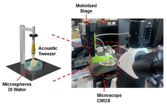 The system of acoustic tweezer experiments is shown in Figure 2. The acoustic tweezers were fixed on a self-made fixture. The fixture was set on a three-axis motorized linear stage that controlled the movement of the acoustic tweezers. Meanwhile, a function generator (AFG3252C, Tektronix) and a 50 dB power amplifier (525 LA, ENI Rochester, Rochester, NY, USA) were used to drive the acoustic tweezers. Photographs and movies of the trapped motions of the microsphere were taken by a microscope (LIOO, Beijing, China) with a CMOS camera. We used 100 μm polystyrene (PS) microspheres (Ruige, Luoyang, China) as the trapping targets.