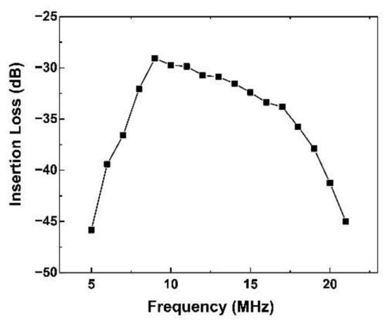 The value of insertion-loss could evaluate the availability of electromechanical efficiency of the acoustic tweezers. The two-way insertion-loss of the acoustic tweezers can be found in Figure 4. The optimal insertion-loss was found at 9 MHz with −29 dB. Furthermore, the insertion-loss in 8 MHz to 17 MHz was retained higher than −33 dB, which means the acoustic tweezers could achieve high sensitivity under a wide excitation/receiving frequency.