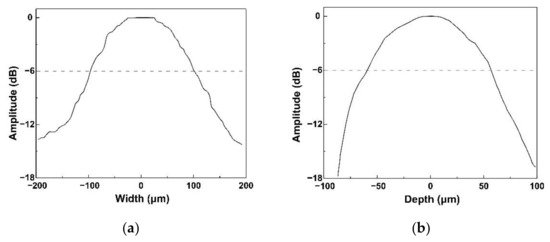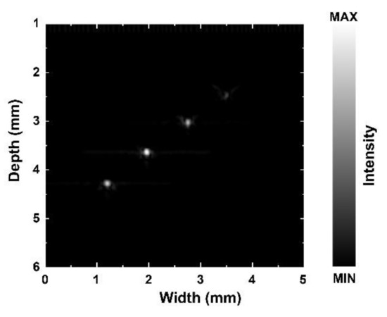 To determine whether the focused process was effective on the acoustic tweezers, four tungsten wire targets with a 35 μm diameter were used to test the resolution of the acoustic tweezers. Figure 5 shows the phantom image. The measured −6 dB lateral and axial resolutions estimated by Figure 5 are shown in Figure 6.