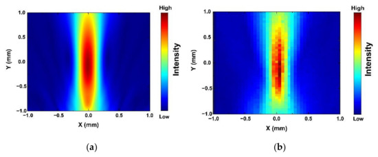 The map of acoustic pressure has been simulated by a finite element method (FEM) in the COMSOL environment, which is shown in Figure 7a. The focal point of the acoustic tweezers was defined as zero point, and the piezo-elements were 2 mm away from the zero point. The high acoustic press area is about 2 mm length and 0.5 mm width. In addition, the measured acoustic pressure field is shown in Figure 7b. The distribution of the acoustic press field is similar to the simulation. There is a 2 mm length and 0.5 mm width high-intensity area. The results illustrates that the simulated map of acoustic pressure is highly reliable.