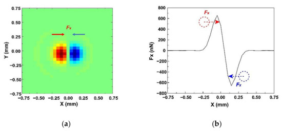 The lateral distributions of the lateral component of force (Fx) on the xy plane for 100 μm diameter PS microsphere are shown in Figure 8. In Figure 8a, the red areas indicate that the orientation of Fx is the positive direction of the x-axis, and the blue areas means the Fx forward to the negative direction of the x-axis. Plots for Fx along the y = 0 line in the force map are shown in Figure 8b. When a microsphere moved to the left, the direction of Fx was to the right. By contrast, when the microsphere moved to the right, the direction of Fx was to the right. Based on this observation, it was concluded that the microparticles can be trapped by the KNN-based acoustic tweezers.