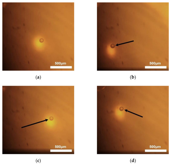 A single PS microsphere with a 100 μm diameter was trapped and manipulated using the KNN-based acoustic tweezers, which is shown in Figure 9. The acoustic tweezers were driven by 10 MHz excitation frequency, 10 mV peak-to-peak voltage with 50 dB signal amplification, 5% duty cycle, and 1 kHz pulse repetition frequency. As can be seen, a single microsphere was manipulated along the movement of the transducer. (The video can be found in Video S1) The arrows represent the movement direction of the transducer. The results demonstrate that the KNN-based textured ceramics could be used for acoustic tweezers.