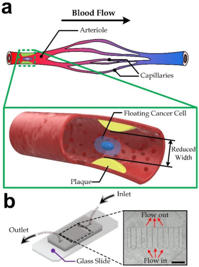 (a) Illustration of a circulating tumor cell (CTC) flowing in a human blood vessel. Inset: an enlarged diagram at the atherosclerosis site. (b) The microfluidic microchannel array device. Inset: microscopic image of microfluidic channels, scale bar: 200 µm.