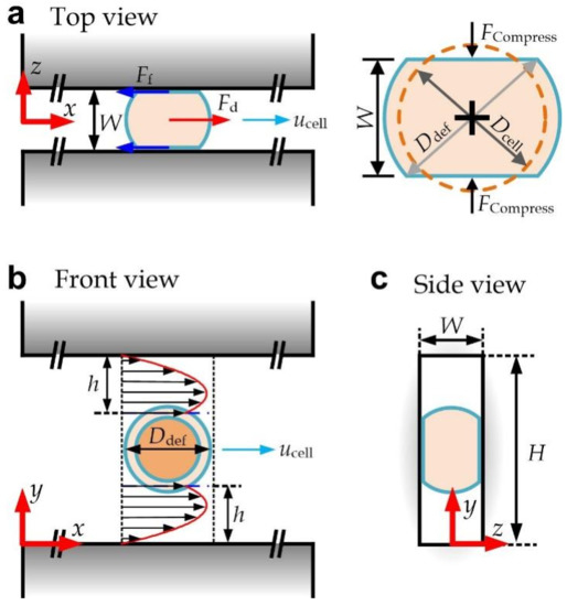 We develop a theoretical model for the cell transiting speed along a constricted microchannel (width W along the z-direction, and height H along the y-direction) and its relationship with key cell physical properties and microchannel configurations, as illustrated in Figure 2. When a cell with a diameter of Dcell enters a narrow microchannel with W < Dcell such that the cell must deform to fit inside the channel. The deformed shape of a cell can be approximated as a sphere with its top and bottom chopped along contacting surfaces on both sides of the channel. As the cell volume should maintain during the deformation, the corresponding diameter of the deformed spheric surface (Ddef) can be expressed as [24]: