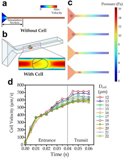 For demonstration, we analyzed a cell with a 16 µm diameter entering a micro-channel under an inlet gage pressure of 16 Pa. The cell morphology change at different time points is shown in Figure 3b. We performed a simulation to obtain the transiting speeds for cell diameters ranging from 12 μm to 22 μm (Figure 3c). It can be observed that the cell transiting speed along the channel (after 0.05 s) is more stable compared to cell velocity when entering the channel (before 0.04 s). In other words, the transiting speeds for a cell at different positions traveling along the microchannel have a very closer value, implying high repeatability and robustness of the measurement. It can be observed that a larger cell induces a slower cell transiting speed.