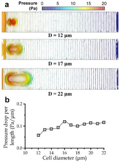 Furthermore, we also calculated the average pressure drop per length along the cell region γ for different cell diameters. We considered pressure iso-surfaces for the region around the deformed cell in the simulation (Figure 4a) to estimate for γ. We summarize the values of γ for different cell diameters in Figure 4b, suggesting that γ values can be considered as roughly a constant value of ~0.0994 Pa/μm.