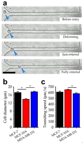 To further verify the theoretical model, we conducted experiments to inject floating cells along the microfluidic channel array. We adopted three breast cell lines: breast benign cell MCF-10A, breast malignant cancer cell MCF-7, and breast invasive cancer cell MDA-MB-231. We took time-lapsed microscopic images and quantified for the deformed/undeformed diameter and transiting speed for each floating cell passing through any of the narrow microchannels. The cell deformation and transiting process for an MDA-MB-231 transiting along the straight channel is provided in Figure 5a as a demonstration. We summarized the average cell undeformed diameter (Figure 5b) and the cell transiting speed (Figure 5c) for individual cell lines. The results conclude that the transiting speed ucell should be negatively correlated with the undeformed cell diameter Dcell, which agrees with both the simulation and the analytical model presented above.