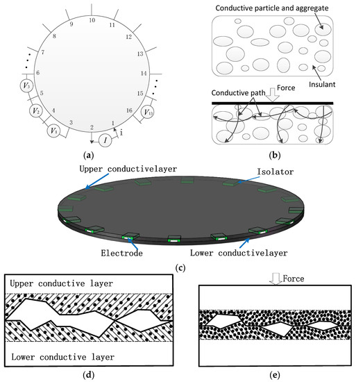 However, up to now, there are very few quantitative measurements about EIT-based tactile sensors. For example, it is hard to get the accurate output of the coordinate of the position and force amplitude when the tactile sensor is pressed. One of the main reasons is that the piezoresistive film has different impedance variation characteristics in a horizontal and vertical direction when it is pressed, as shown in Figure 1b [22,23]. It can be seen that the change in impedance is very significant in the vertical direction, but very slight in the horizontal direction because the pressed force is vertical. Whereas the injected current from the driving electrodes is spread horizontally over the whole plane of the tactile sensor. The vertical press has a smaller effect on the spread of the horizontal current so that the change in potential at the boundary of the tactile sensor is unobvious. It leads to poor imaging accuracy for the pressed position detection, and it is nearly unidentifiable or even miscalculated especially when the pressed area is less, or the pressed force is slighter. At present, the EIT-based tactile sensors are normally used for the imaging of the pressed position, but not for the pressed force detection because of the poor sensitivity.