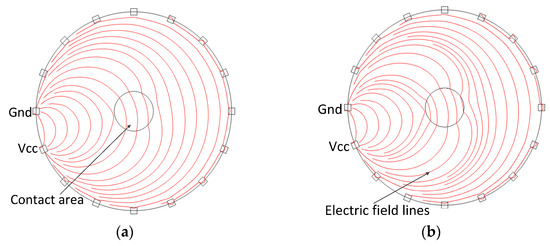 In order to improve the sensitivity and accuracy of the dynamic EIT imaging, a new structure including two piezoresistive sheets with the same resistance characteristics was proposed, as shown in Figure 1c. The two piezoresistive sheets are stacked together to form a double-layer structure. The 16 electrodes are evenly spaced around the lower layer and isolated from the upper one. The contact surface of two piezoresistive sheets is not very smooth in fact, and there are lots of micro-structures [24]. When there is no external force exerting on the sensor as shown in Figure 1d, the flow of the current in the lower layer is nearly unaffected by the upper piezoresistive sheet because the micro-structures at the contact surface of both the upper layer and lower layer cause less real contact area, and thus the upper layer has nearly no effect on horizontal flow current spread. However, the resistance in the contact area will decrease more obviously under the action of external force, as shown in Figure 1e. In this case, the more electric conductive path of horizontal direction is formed in the contact area because of the bigger deformation of the micro-structures. The horizontal spread flow current will be more concentrated when going through the low-impedance contact area between the upper and lower layer. The impedance in the contact area changes greatly, and the local electric field also changes more obviously. In this way, the sensitivity of the sensor to orthogonal pressure is improved. The comparison of flow current distribution between the single layer and double layers under the same pressed force is shown in Figure 2a,b. It can be seen that the flow current trajectory changes more obviously than the single layer. This will produce a relatively larger potential variation at the sensor boundary.